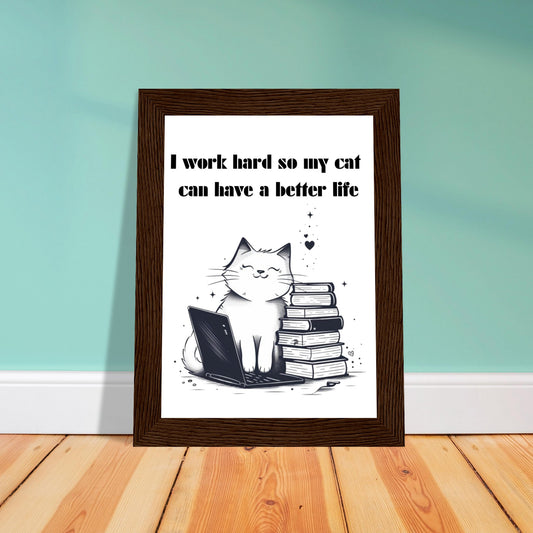 Premium Matte Paper Wooden Framed Poster 'I work hard so my cat can have a better life'